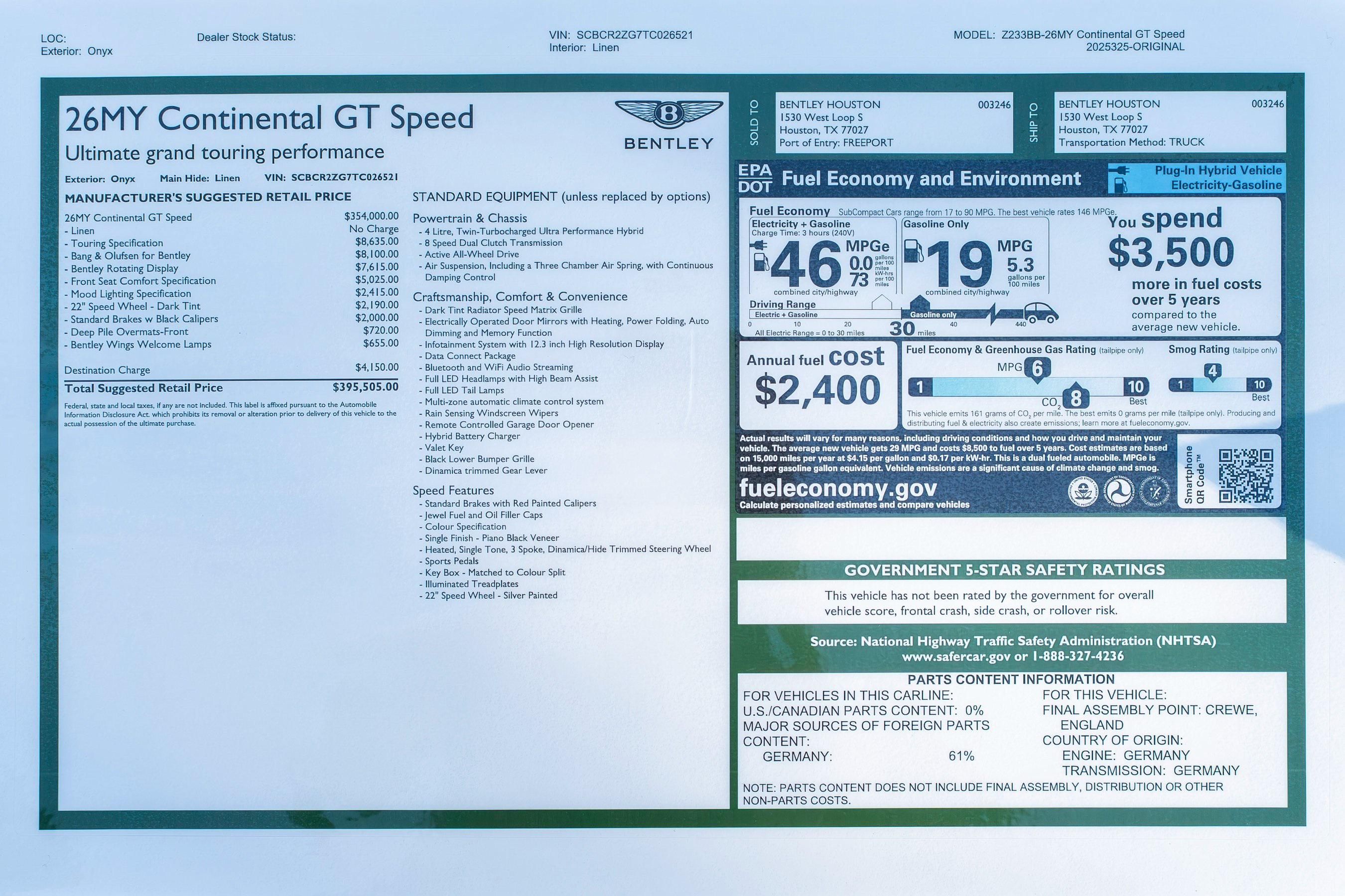 2026 Bentley Continental GT Speed presented by Bentley Houston. Onyx with Linen and Beluga interior, this GT features 22"" Speed Wheels in Dark Tint Finish with Standard Brakes with Black Calipers, Bentley Wings Welcome Lamps, Touring Specification, Front Seat Comfort Specification, Mood Lighting Specification, Bentley Rotating Display, Bang & Olufsen Audio System for Bentley and Deep Pile Overmats - Front.This vehicle has already received our premium Full-Front Paint Protection Film Package and Ceramic Coating treatment - an exclusive package professionally applied and included with your purchase.About Post Oak Motor Cars:Post Oak Motor Cars, a Fertitta Automotive Company, proudly represents Bentley, Rolls-Royce Motor Cars Houston, Bugatti, Karma, Lotus, Zenvo, Brabus, Hennessey, and Vintage Modern. Located in the prestigious Post Oak Complex in Uptown Houston, our flagship showroom offers an immersive luxury experience - surrounded by fine dining, designer fashion, luxury spa, and elegant accommodations. We also welcome you to our Lotus of The Woodlands showroom, located at 1501 Lake Robbins Drive. Our state-of-the-art service center and accessories boutique are supported by Certified Brand Representatives who can assist with: