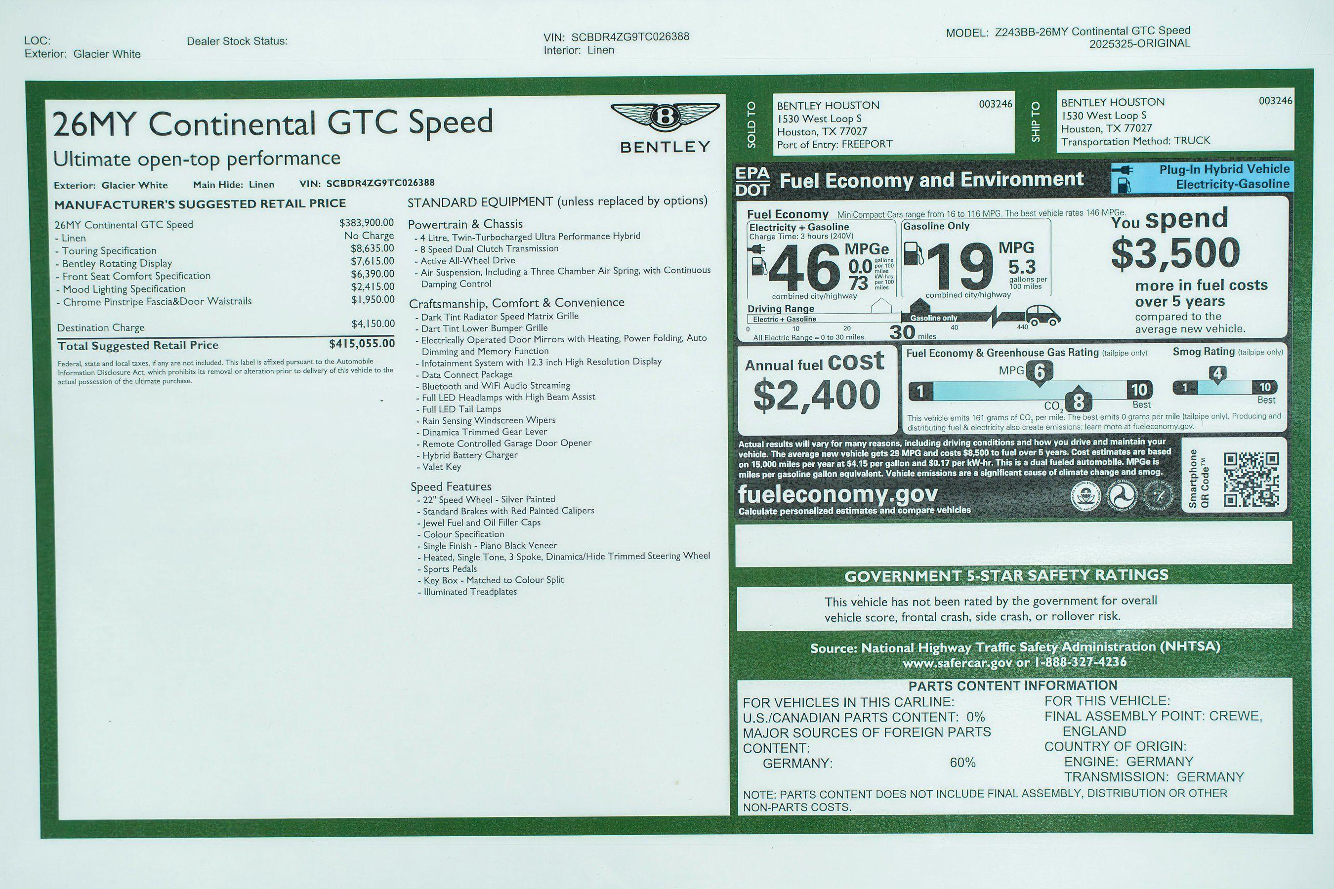 2026 Bentley Continental GTC Speed presented by Bentley Houston. Glacier White with Linen and Brunel interior, this GTC features Touring Specification, Front Seat Comfort Specification, Mood Lighting Specification, Bentley Rotating Display and Chrome Pinstripe Fascia & Door Waistrails.This vehicle has already received our premium Full-Front Paint Protection Film Package and Ceramic Coating treatment - an exclusive package professionally applied and included with your purchase.About Post Oak Motor Cars:Post Oak Motor Cars, a Fertitta Automotive Company, proudly represents Bentley, Rolls-Royce Motor Cars Houston, Bugatti, Karma, Lotus, Zenvo, Brabus, Hennessey, and Vintage Modern. Located in the prestigious Post Oak Complex in Uptown Houston, our flagship showroom offers an immersive luxury experience - surrounded by fine dining, designer fashion, luxury spa, and elegant accommodations. We also welcome you to our Lotus of The Woodlands showroom, located at 1501 Lake Robbins Drive. Our state-of-the-art service center and accessories boutique are supported by Certified Brand Representatives who can assist with: