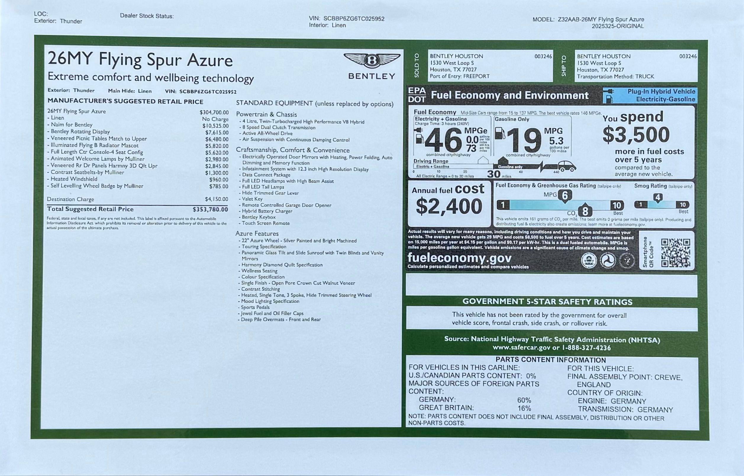2026 Bentley Flying Spur Azure presented by Bentley Houston. Thunder with Linen and Imperial Blue interior, this Flying Spur features Self Levelling Wheel Badges by Mulliner, Illuminated Flying B Radiator Mascot, Animated Welcome Lamps by Mulliner, Heated Windshield, Full Length Center Console - 4 Seat Configuration, Bentley Rotating Display, Naim Premium Audio System for Bentley, Veneered Rear Door Panels Harmony 3D Quilted Upper with Veneered Picnic Tables Match to Upper, and Contrast Seatbelts - by Mulliner. This vehicle has already received our premium Ceramic Coating treatment - an exclusive package professionally applied and included with your purchase.About Post Oak Motor Cars:Post Oak Motor Cars, a Fertitta Automotive Company, proudly represents Bentley, Rolls-Royce Motor Cars Houston, Bugatti, Karma, Lotus, Zenvo, Brabus, Hennessey, and Vintage Modern. Located in the prestigious Post Oak Complex in Uptown Houston, our flagship showroom offers an immersive luxury experience - surrounded by fine dining, designer fashion, luxury spa, and elegant accommodations. We also welcome you to our Lotus of The Woodlands showroom, located at 1501 Lake Robbins Drive. Our state-of-the-art service center and accessories boutique are supported by Certified Brand Representatives who can assist with:
